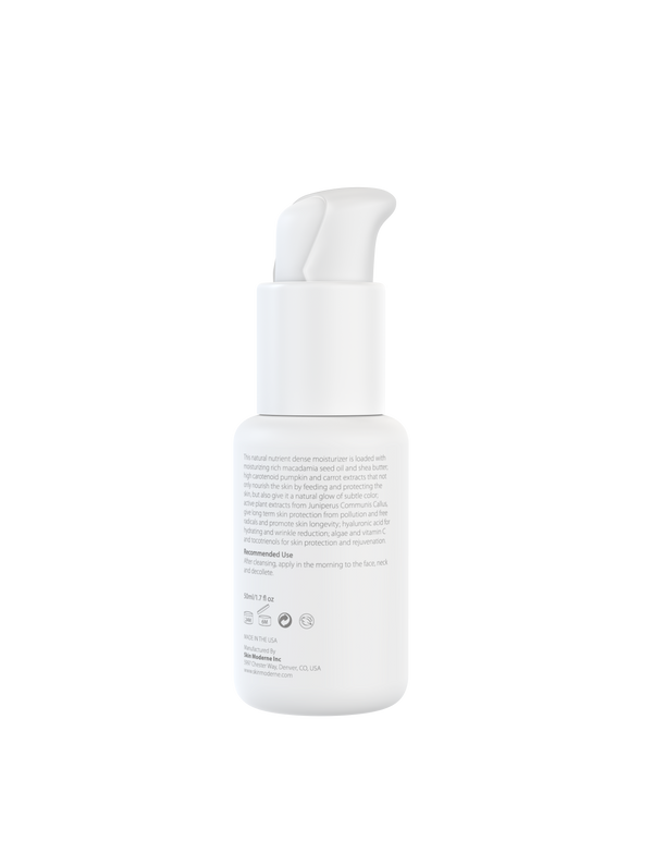 This natural nutrient-dense anti-aging cream is loaded with moisturizing rich macadamia seed oil and shea butter; high carotenoid pumpkin and carrot extracts that not only nourish the skin by feeding and protecting the skin but also give it a natural glow of subtle color; active plant extracts from Juniperus Communis Callus, give long term skin protection from pollution and free radicals and promote skin longevity; hyaluronic acid for hydrating and wrinkle reduction; algae and vitamin C and tocotrienols for skin protection and rejuvenation.