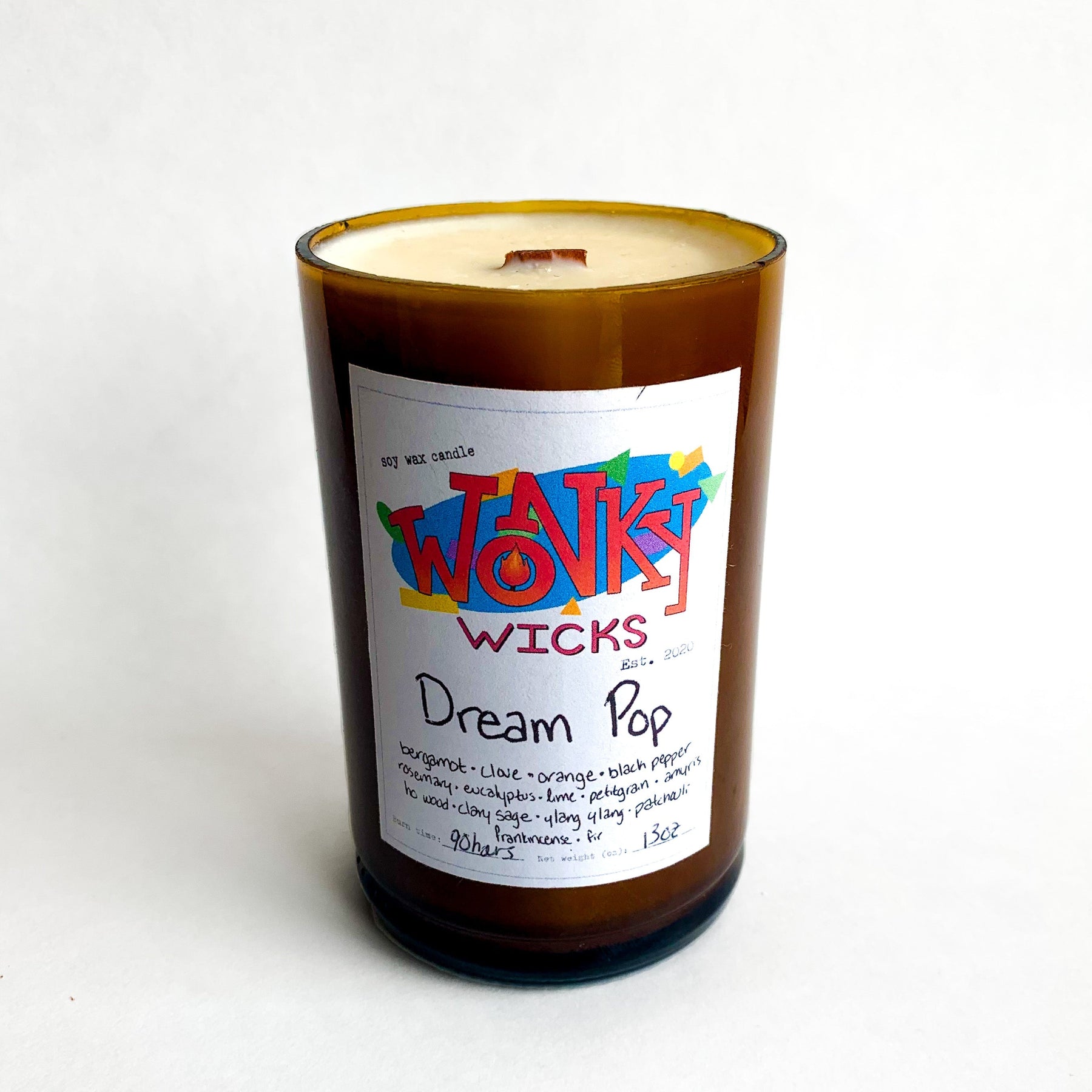 Wonky Wicks are made from repurposed glass bottles, so the shape and color of vessel may vary. All candles are scented only with essential oils for a natural aroma that retains all the aromatherapeutic benefits of our plant-based ingredients. This candle weighs 15oz for a 105 hour burn time and features a 100% wooden wick.