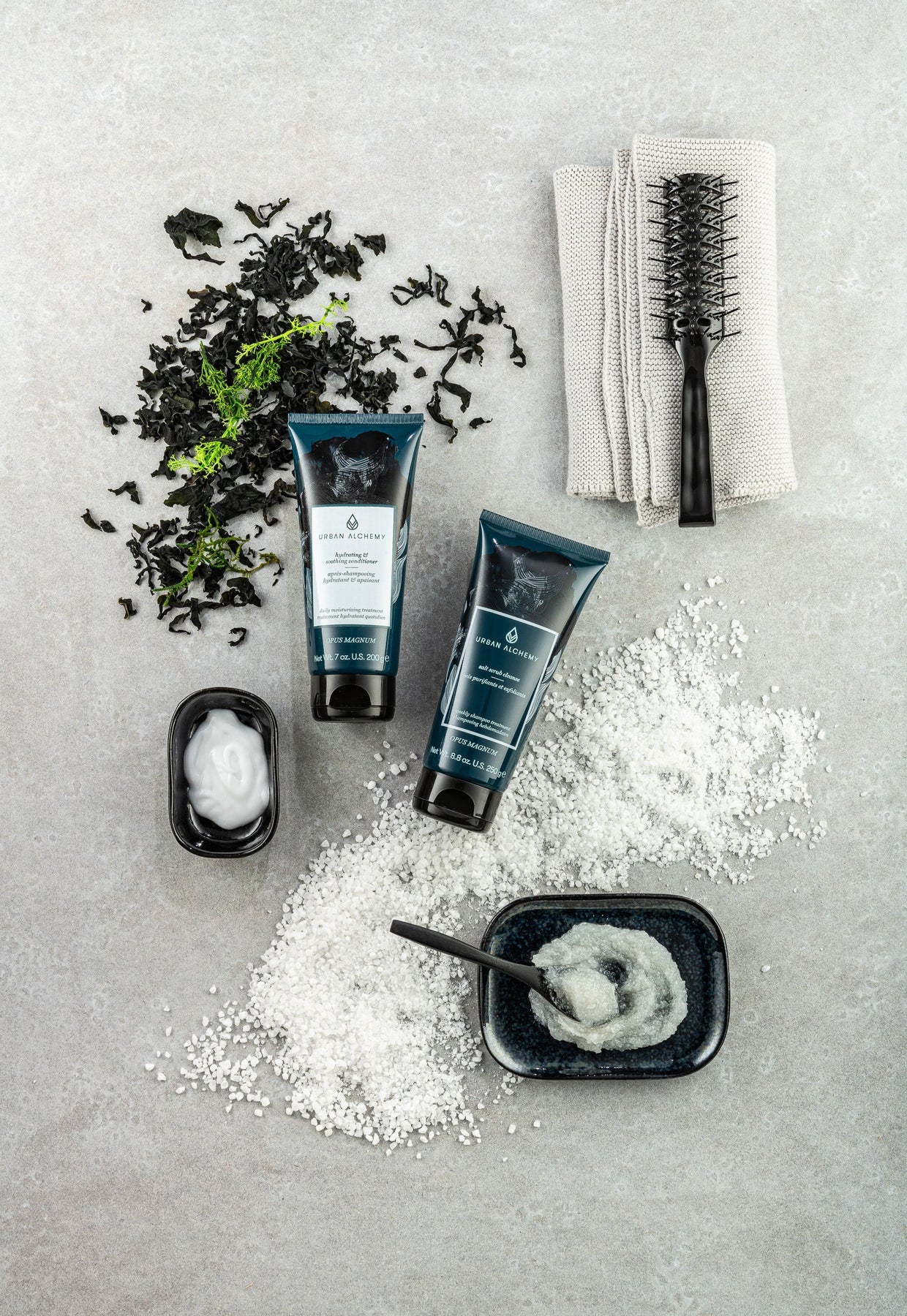 Urban Alchemy Hydrating and Soothing Conditioner is the perfect moisturizing compliment to the salt scrub cleanse. Seaweed extracts and pro-vitamin B5 help to condition and moisturize the hair to improve its natural shine.