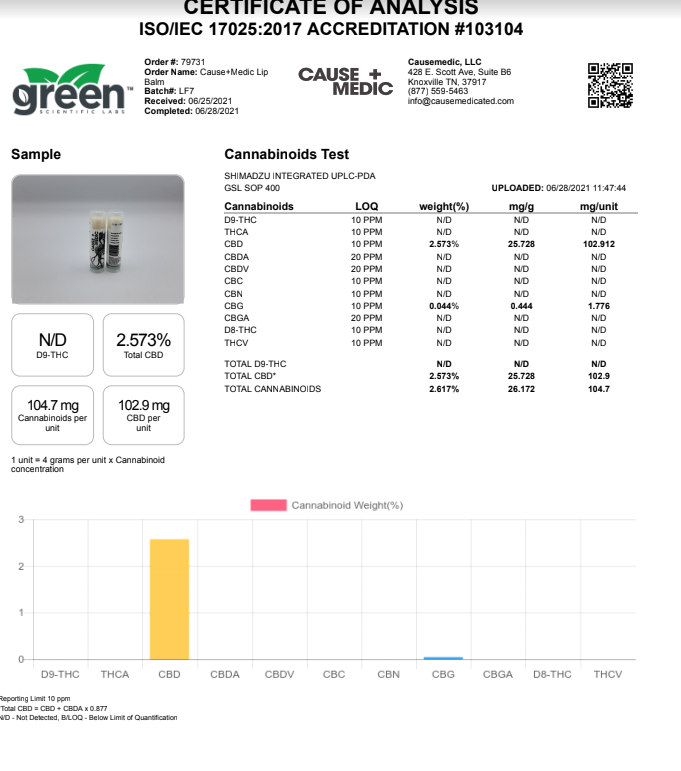 Just what the doctor ordered for dry, chapped lips. CAUSE+MEDIC's CBD-infused lip balm is a perfect harmony of their water-soluble CBD and other active botanical ingredients. The balm does not contain any irritants or taste and will leave your lips feeling nourished and healthy.