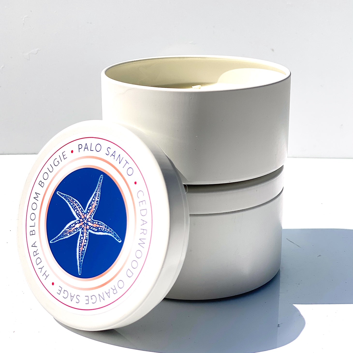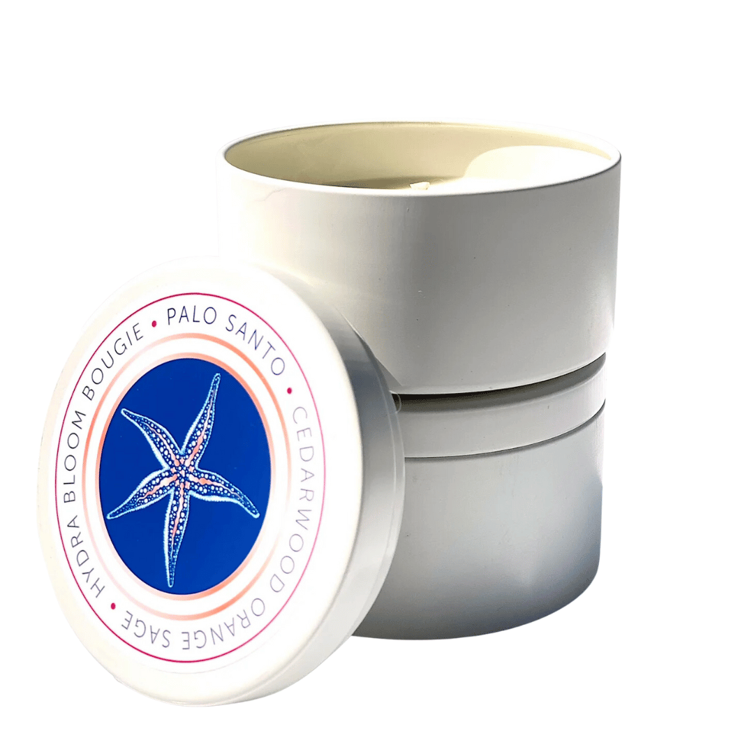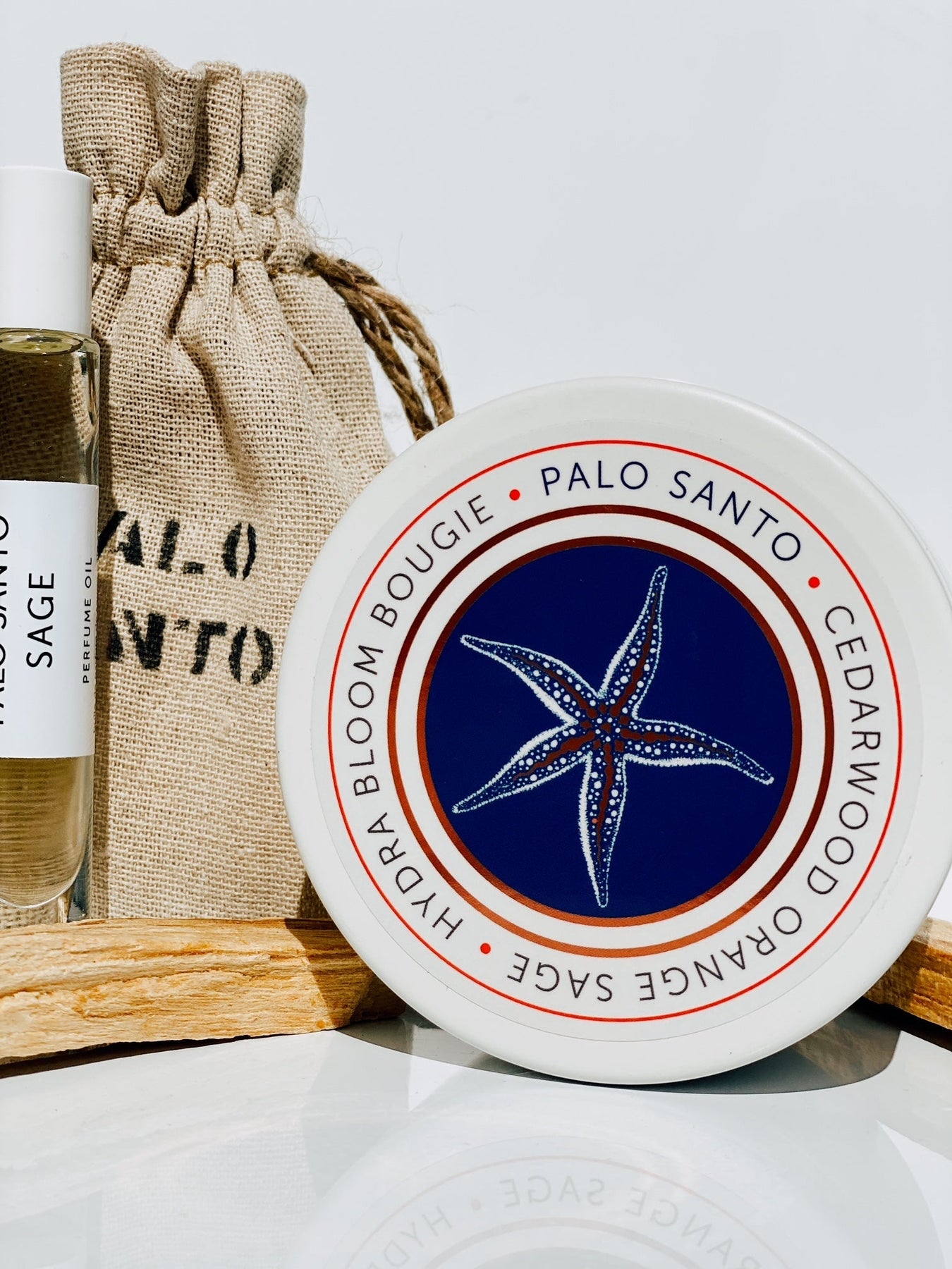 Hydra Bloom's woody & earthy Palo Santo + Sage Cotton Wick is made with coconut oil and soy, and is hand-poured in their artisan factory in Southern California. This is a Glass boxed candle.