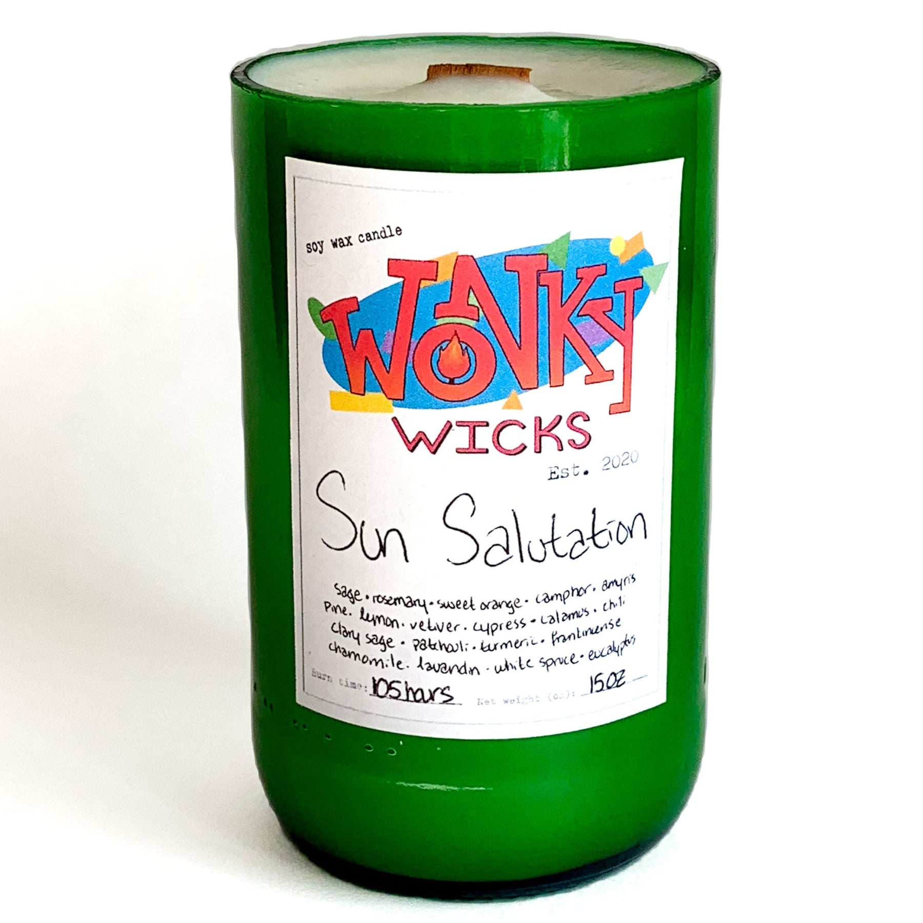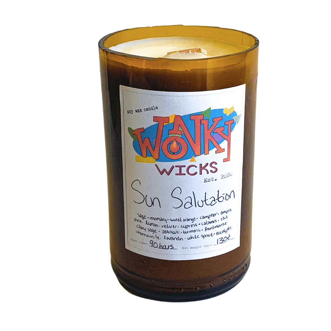 Wonky Wicks are made from repurposed glass bottles, so the shape and color of vessel may vary. All candles are scented only with essential oils for a natural aroma that retains all the aromatherapeutic benefits of our plant-based ingredients.