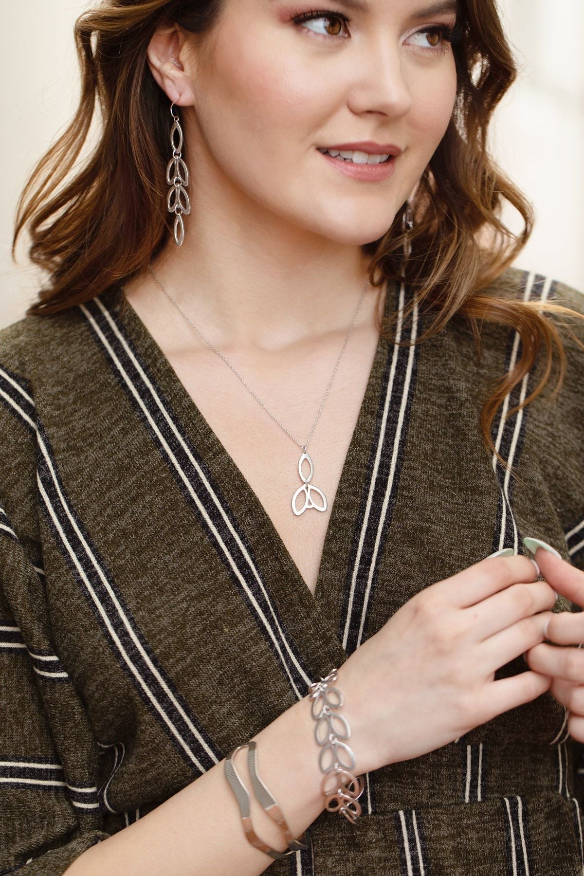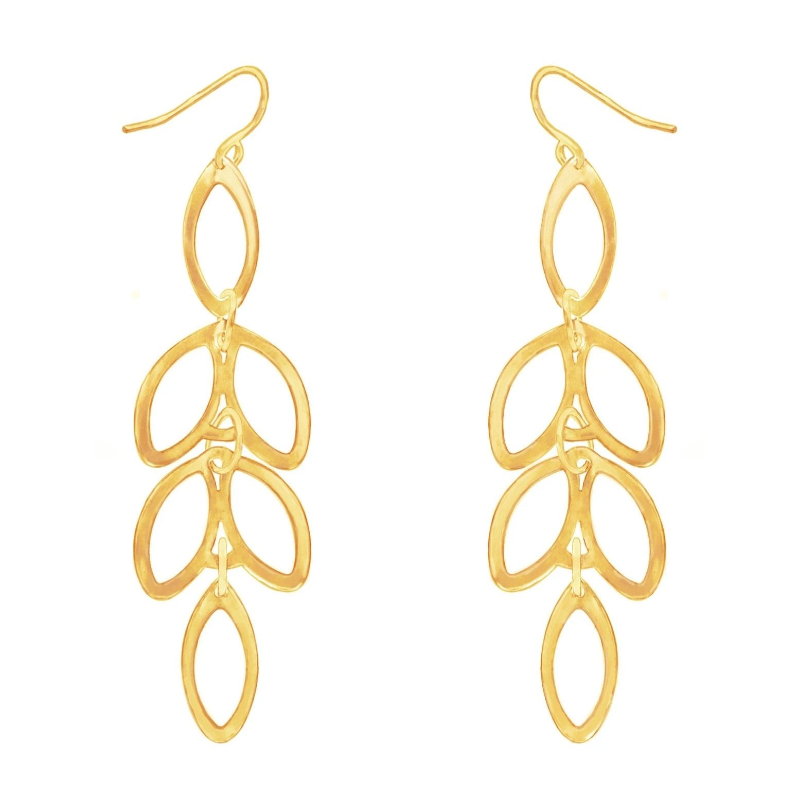 These statement earrings look like a cascade of delicate leaves and will bring a glowing finish to any hairstyle. Pair them with the Catalina necklace for a casual event or a night on the town.