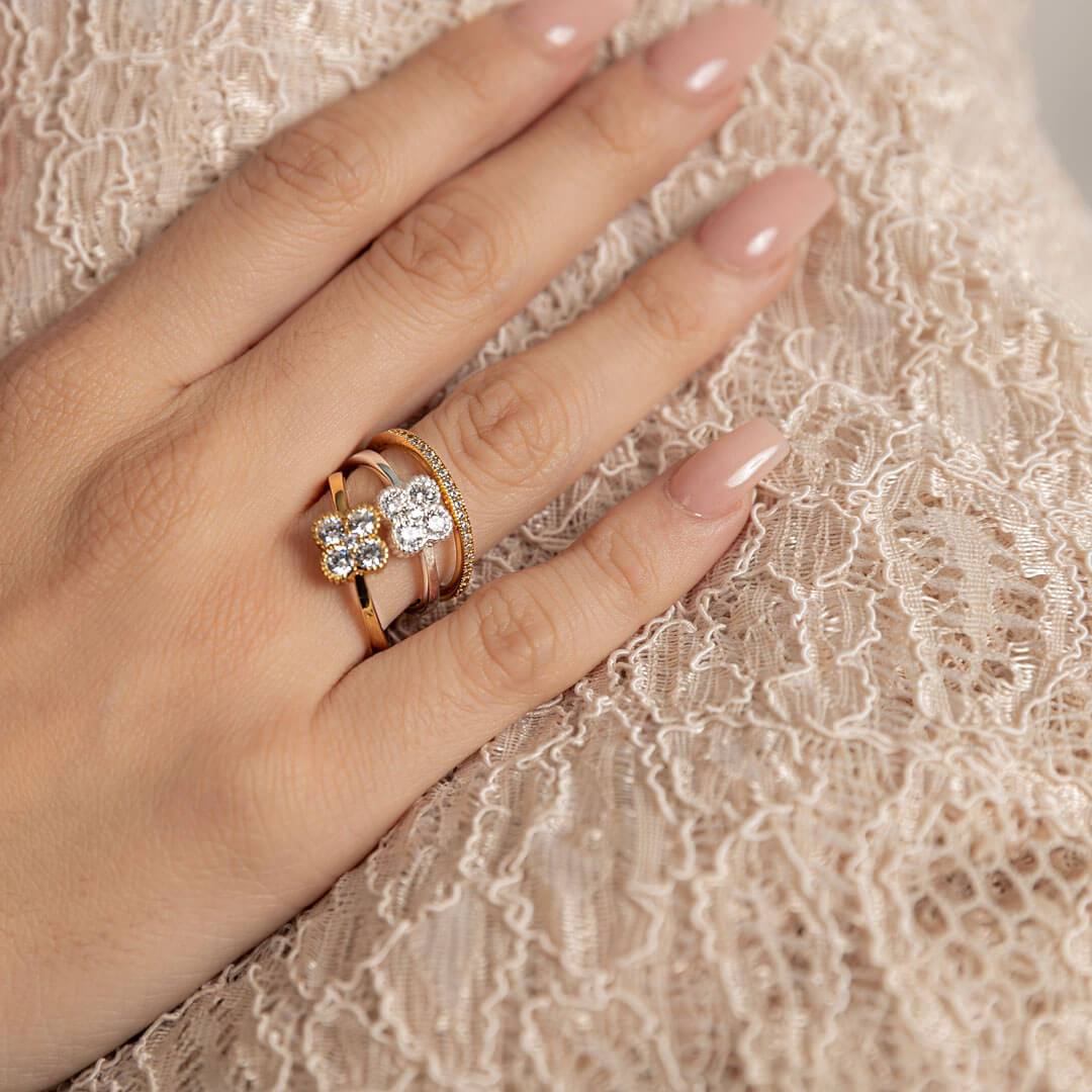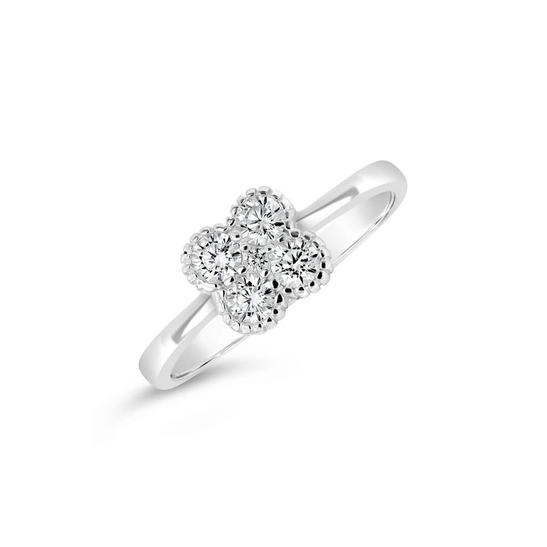 Lucky you! This little sparkler of a ring features a four leaf clover design. Stack it with other rings for even more luck!