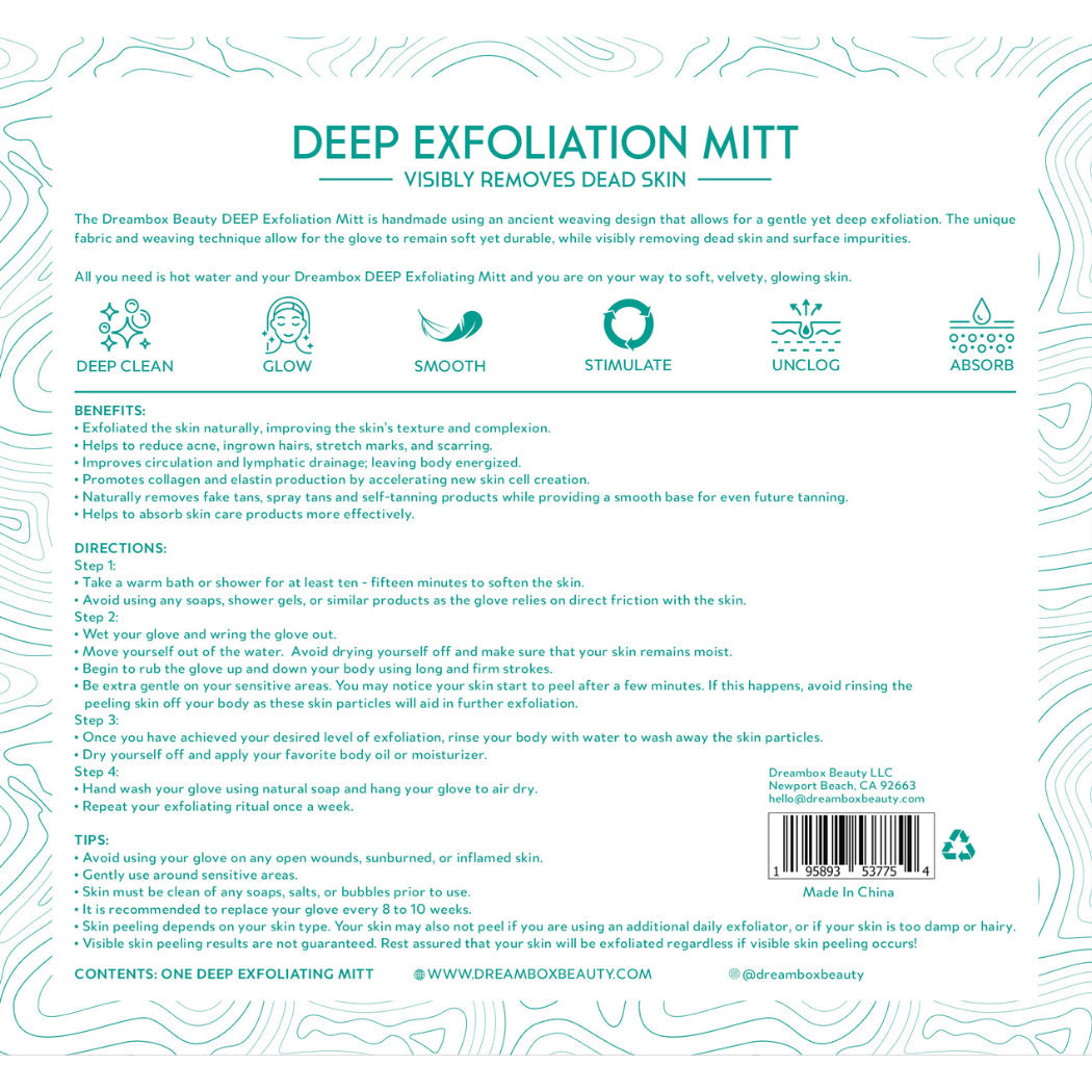 The Dreambox Beauty Deep Exfoliating Glove is handmade using an ancient weaving design that allows for a gentle yet deep exfoliation. The unique fabric weaving technique allows for the glove to remain soft yet durable, while visibly removing dead skin and surface impurities.