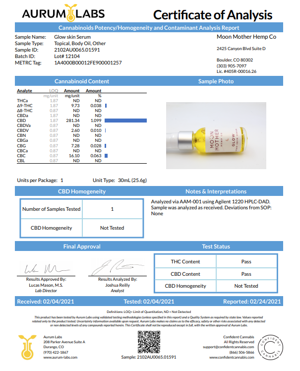 Glow Skin Serum is a daily moisturizer that is suitable for all skin types. Their all-natural, organic proprietary blend for skin contains a nourishing and balancing combination of herbs infused in jojoba oil, argan oil, rose and, of course, their full spectrum hemp extract.
