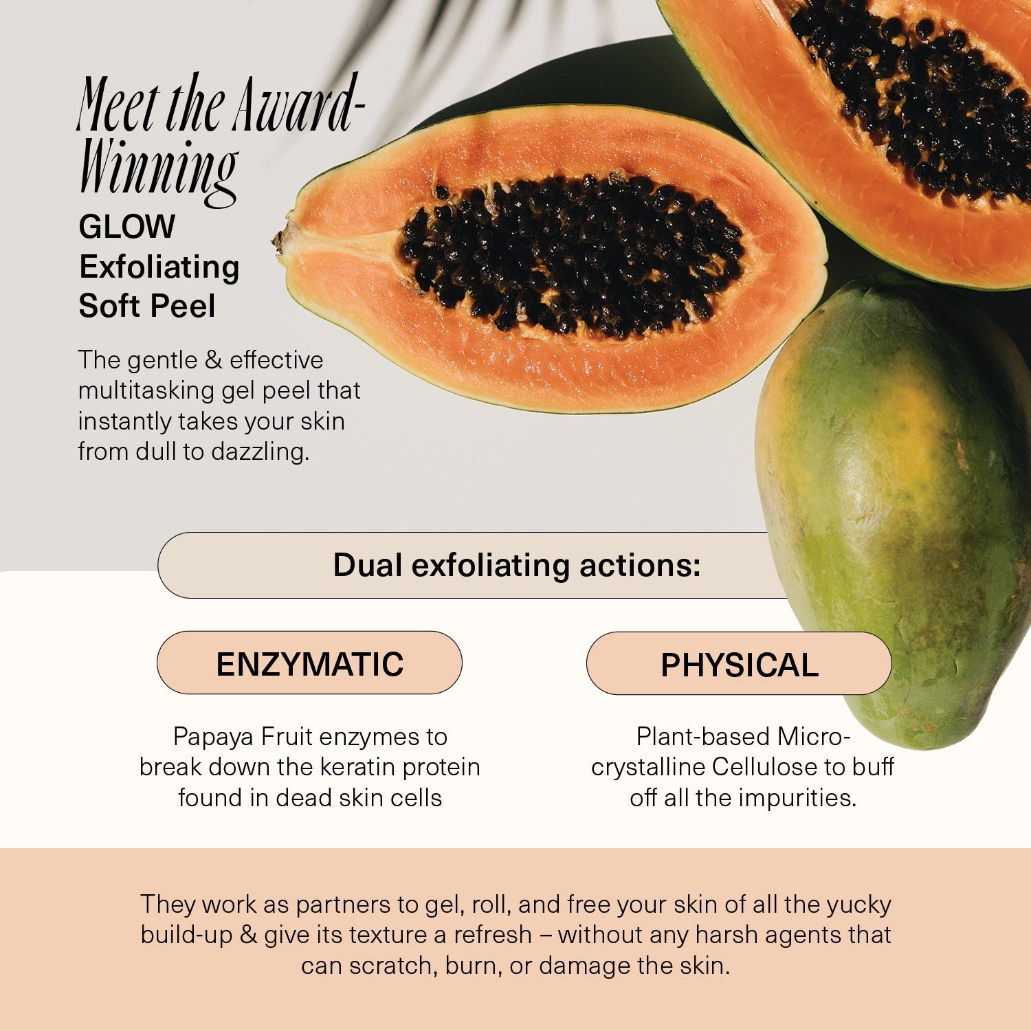 Their multitasking gel peel removes dead skin cells, smooths texture, clears pores, brightens and locks in moisture to instantly reveal the soft, fresh glowing skin of your dreams. GLOW Exfoliating Soft Peel also primes your skin to better absorb the benefits of other products in your daily skincare ritual, resetting your skin to a silky, supple, radiant state.