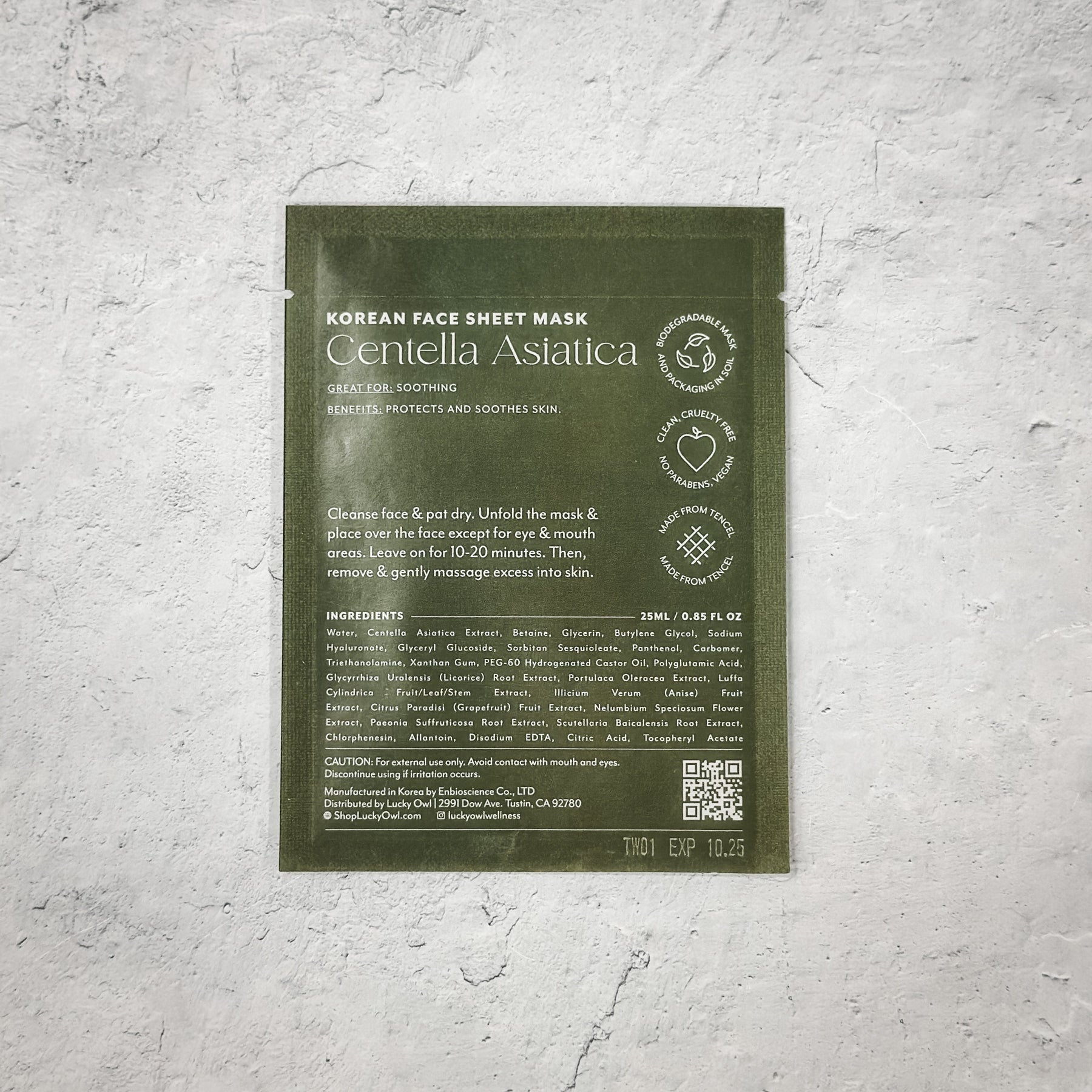 A set of 5 different eco-friendly Korean face sheet masks by Lucky Owl, a unisex gifting company encouraging wellness. They are made of Tencel, a biodegradable skin-friendly material made from responsibly sourced wood pulp that can fully revert to nature and dipped in powerful essences that act quickly to restore and improve the skin.
