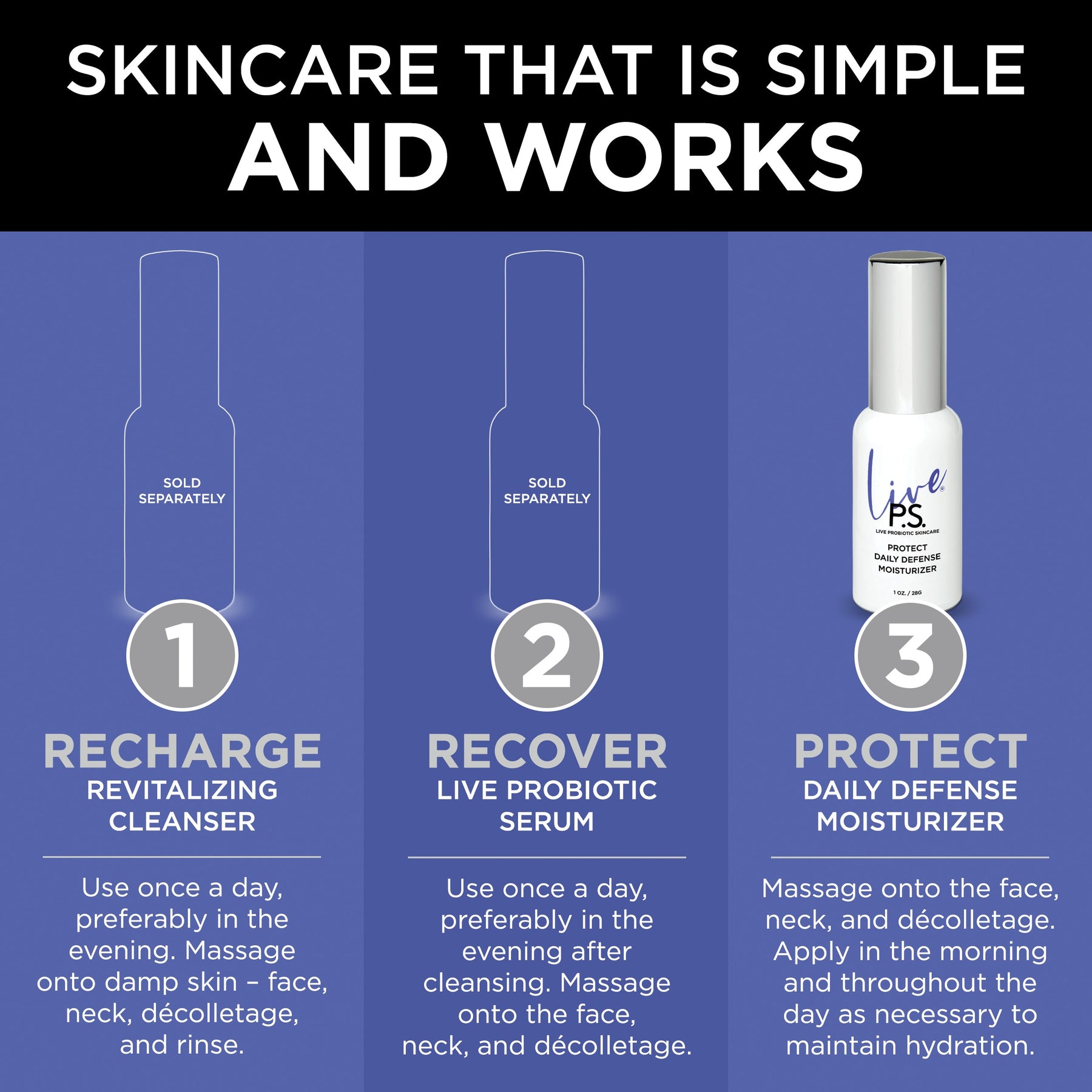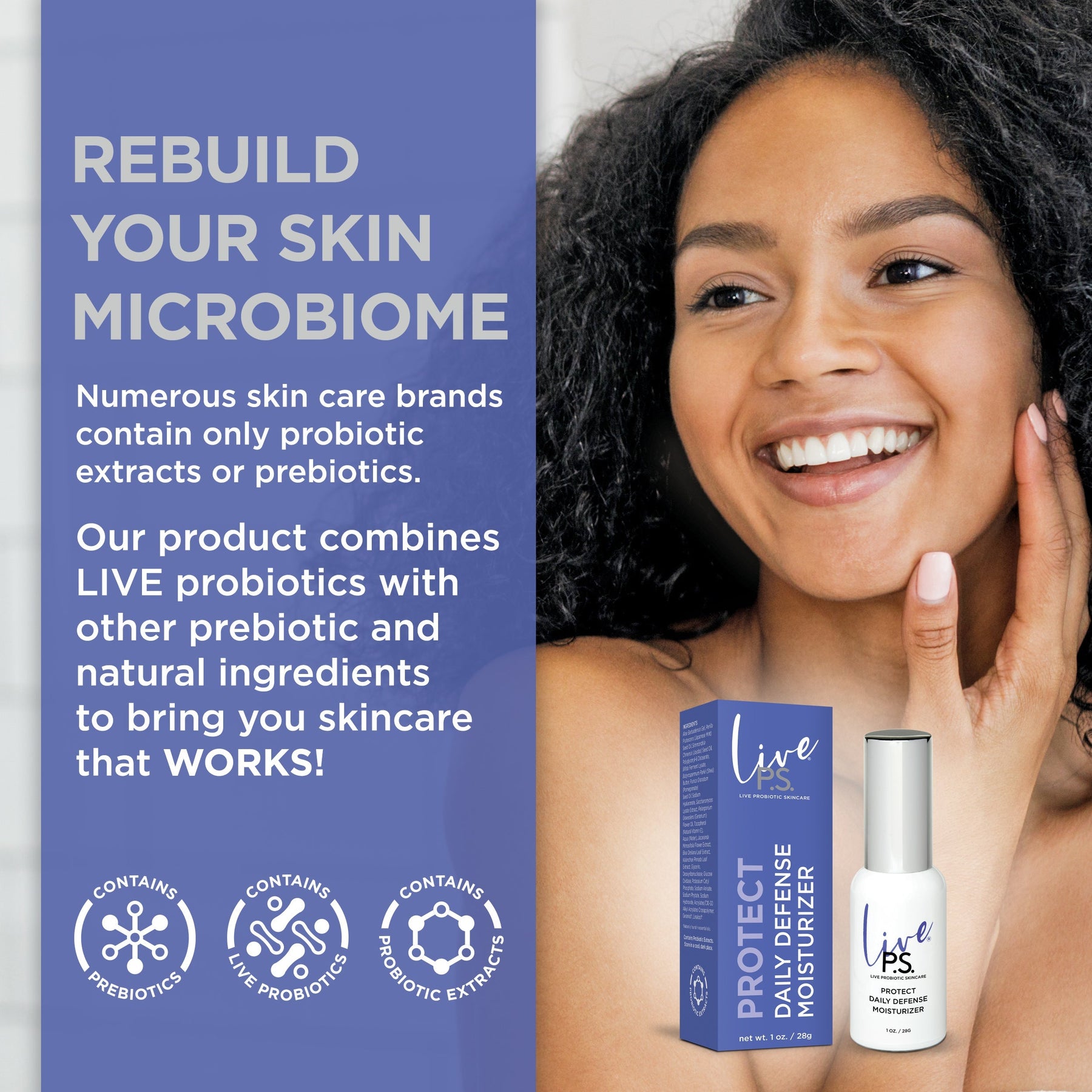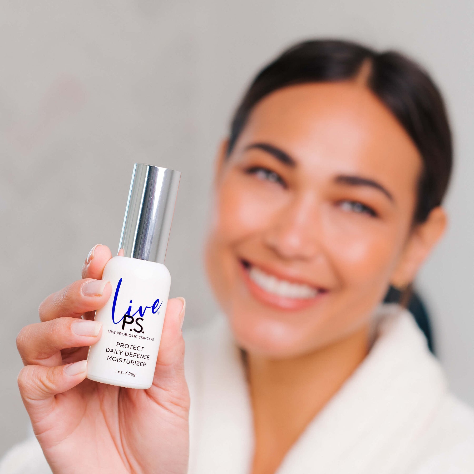 A soothing antioxidant rich complex that helps replenish the skin microbiome. Packed with vitamin D3, hyaluronic acid, and vitamin C, Live P.S.® Daily Defense Moisturizer helps hydrate and plump the skin.