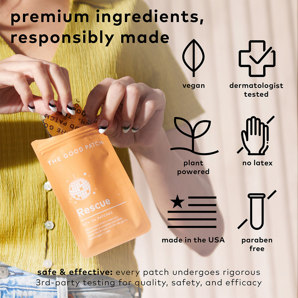 A plant-powered wearable wellness patch to help you bounce back after a night out. Infused with DHM, Green Tea, and Vitamin B1. Stick a patch on before the fun begins or after it ends. Available in standard 4ct, white & gold print 4ct, and party packs.