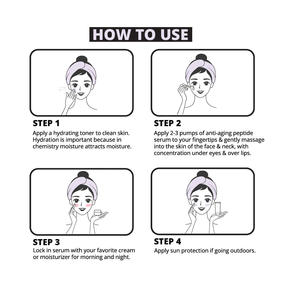 The properties of copper peptides, polypeptides, and hyaluronic acid present in this Anti-Aging Peptide Serum help to remove fine lines and wrinkles from the face, neck, eyes, and smile lines.
