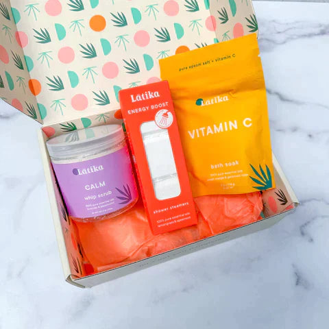 Treat yourself to the ultimate pampering experience with Latika Beauty's Gift Box  featuring a decadent Whip Scrub, an Aromatherapy Shower Steamer, and a luxurious Vitamin C Epsom Salt Bath Soak for the bath experience.