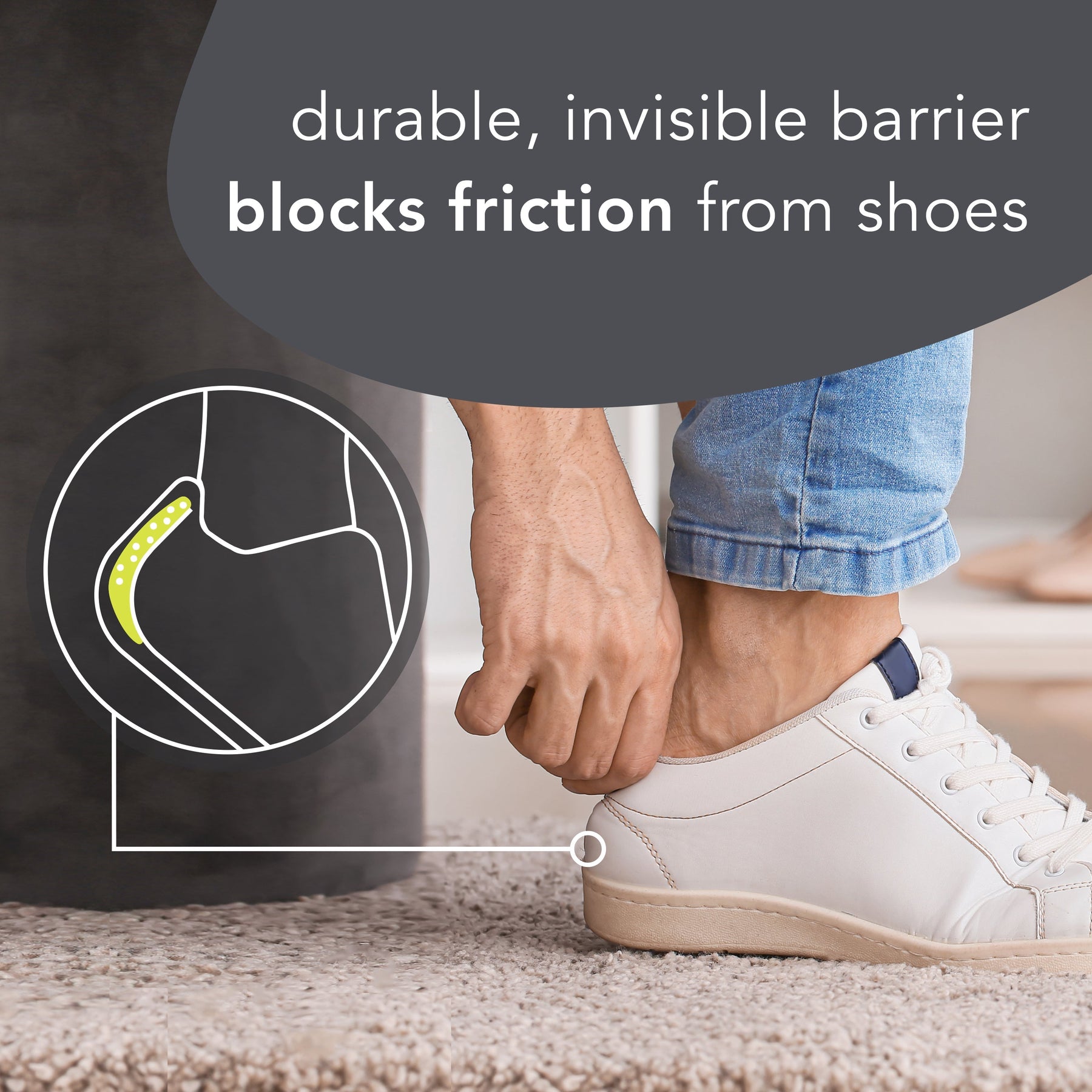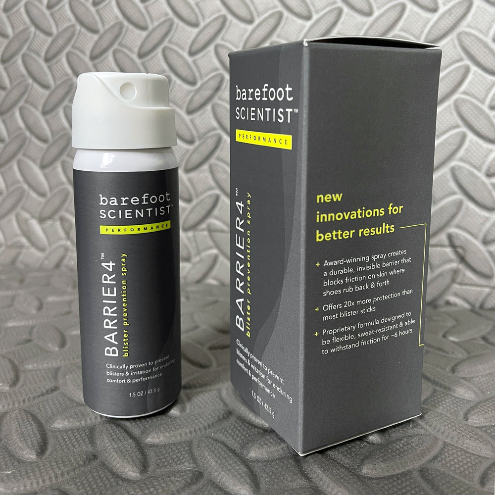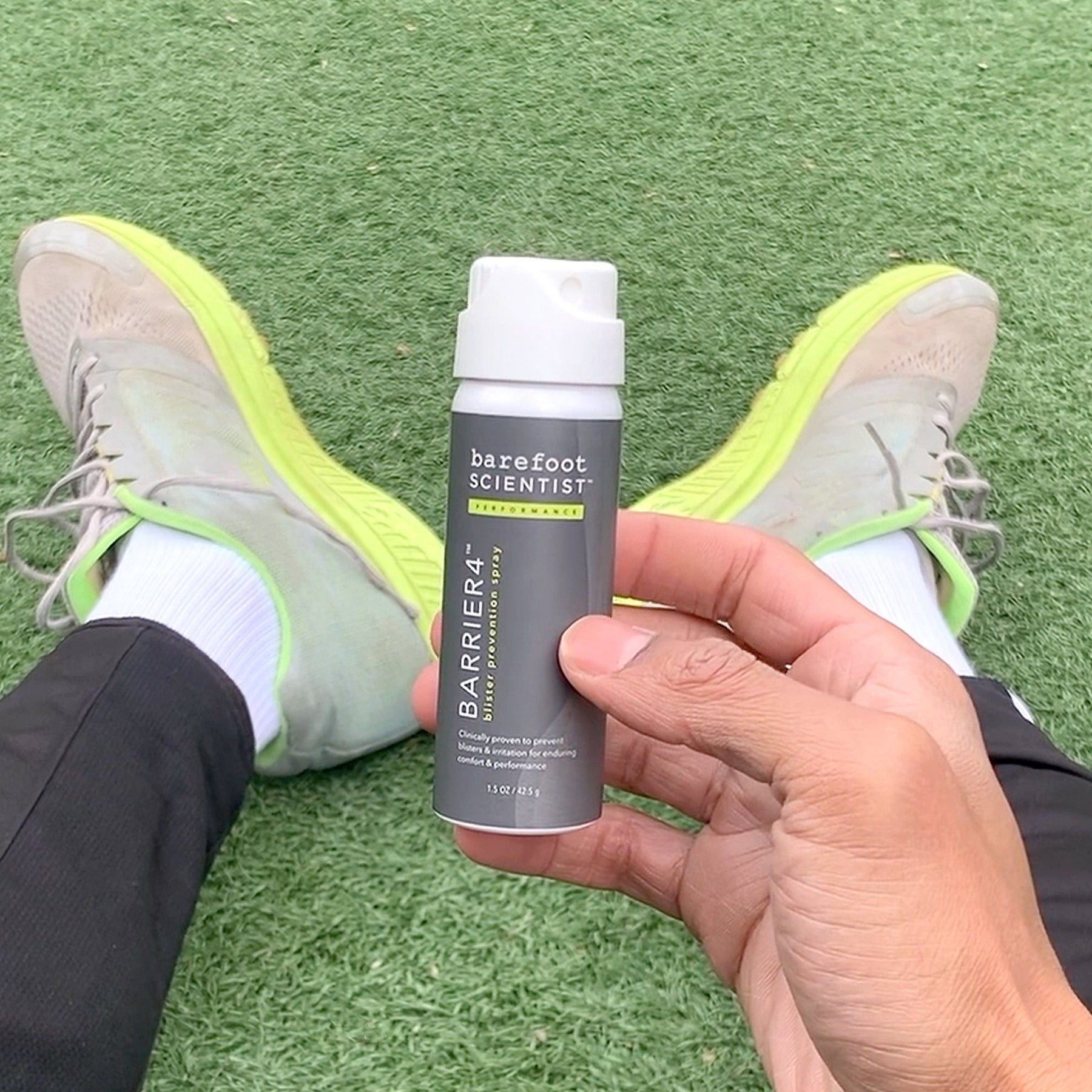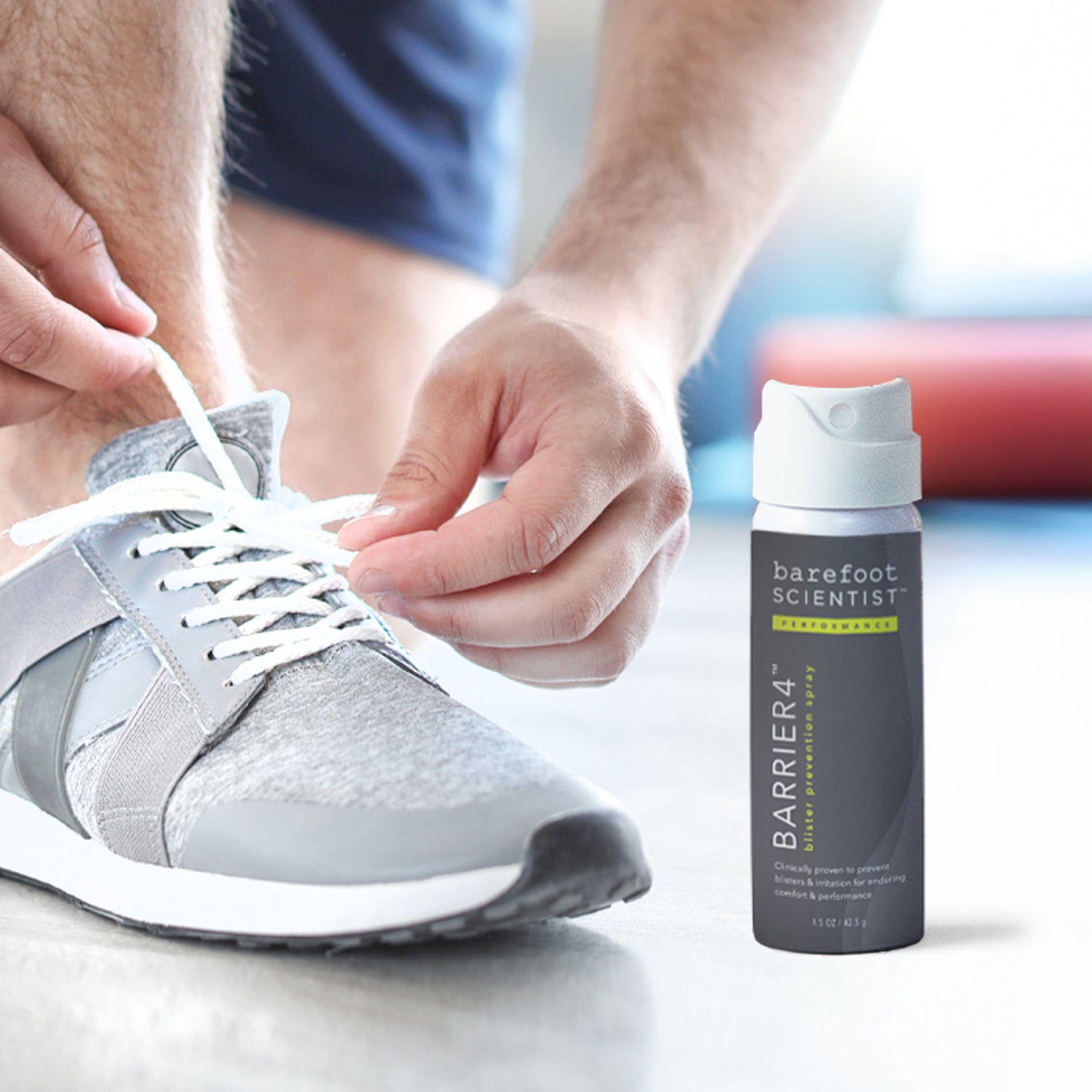 This blister prevention spray creates a durable, invisible barrier that blocks friction on skin where shoes rub back and forth.