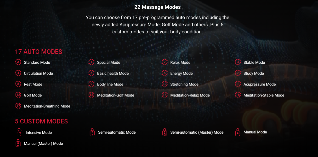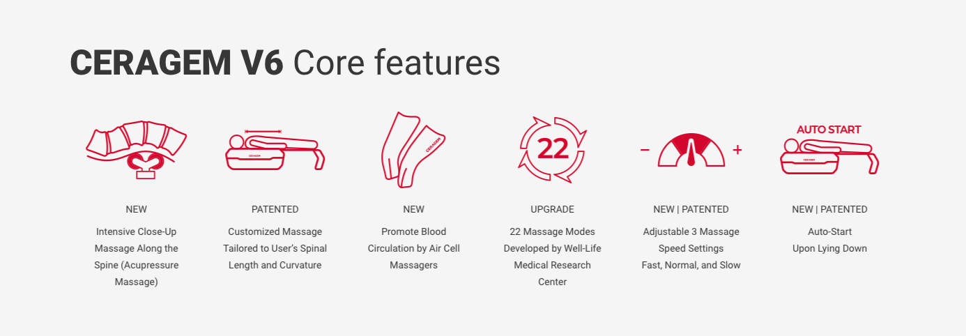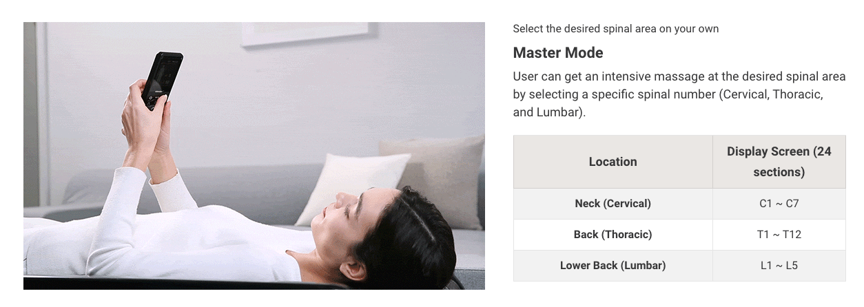• FDA cleared class II medical device / Patented easy sliding design • Patented spinal scanning technology • 22 Different massage modes • Boost circulation using the AIR CELL MASSAGER • 149°F Concentrated heat along the spine