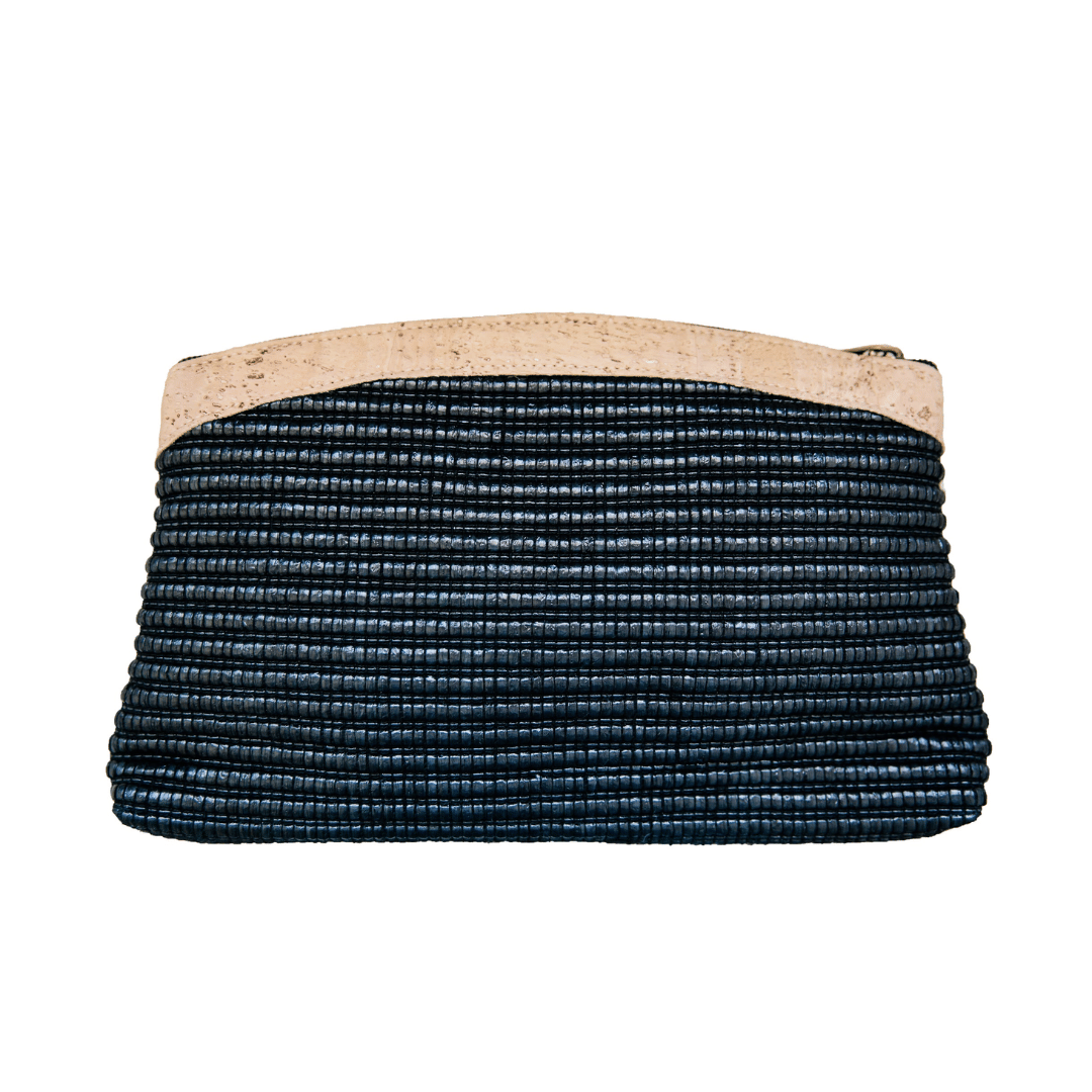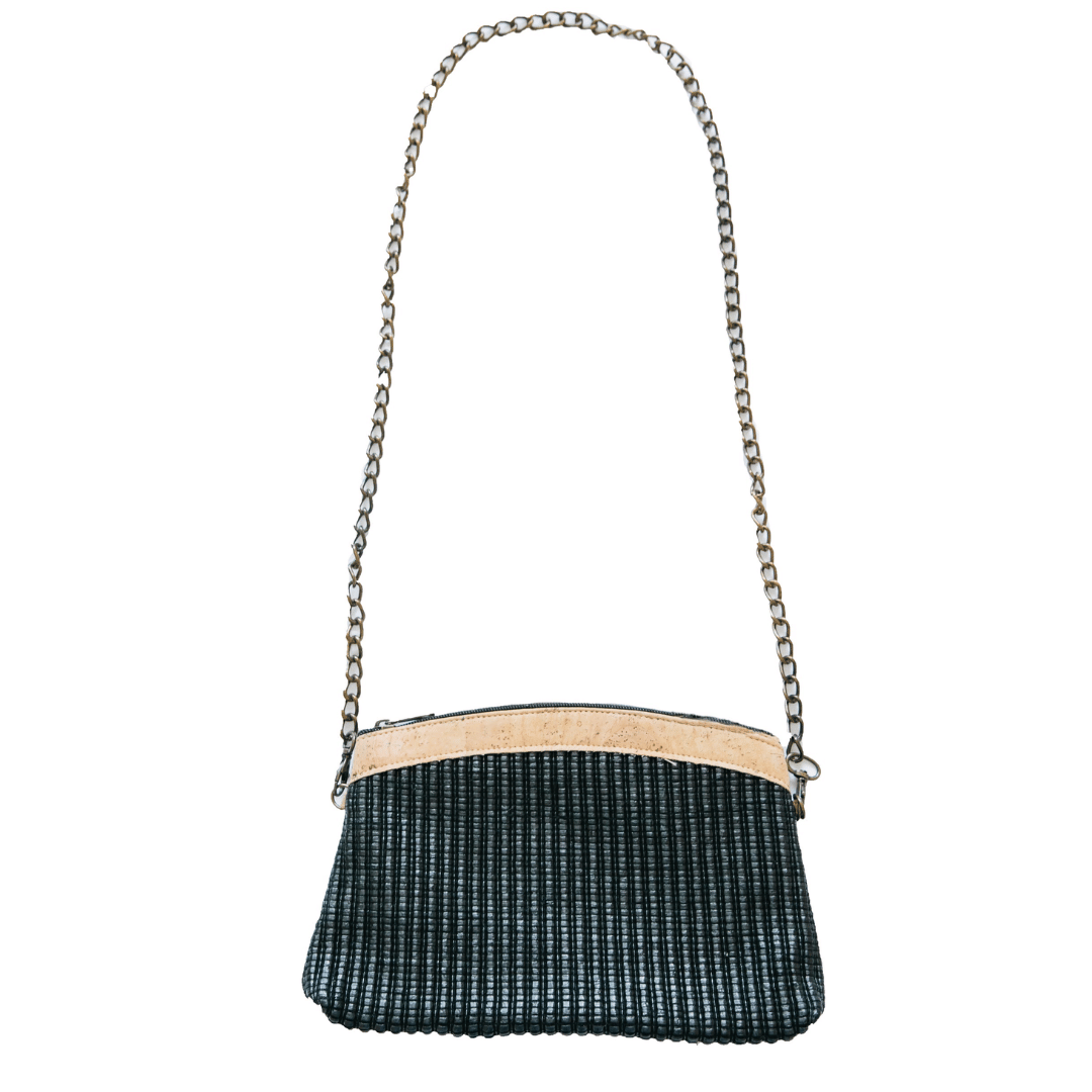 An eco-friendly, stylish clutch easily converts from a convenient day purse to a beautiful evening clutch. The black Moonstone Clutch Purse closes securely with a zipper and is easy to carry by hand or by its versatile 10 x 5 shoulder chain.