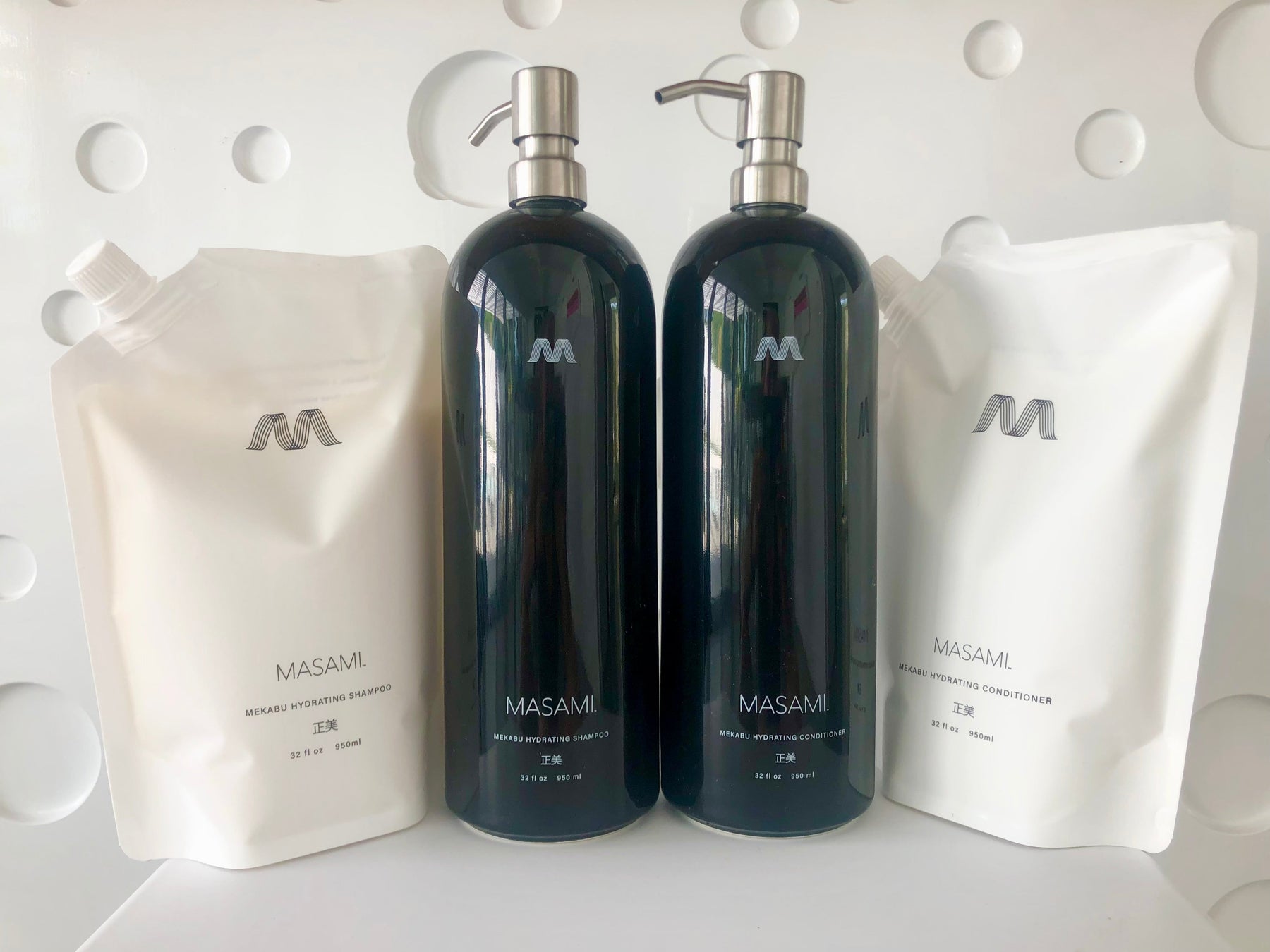 Unlock the secret to Japanese haircare excellence with MASAMI's Mekabu Hydrating line. This salon-size set includes luxurious and refillable 32 oz bottles and pouches for both shampoo and conditioner.