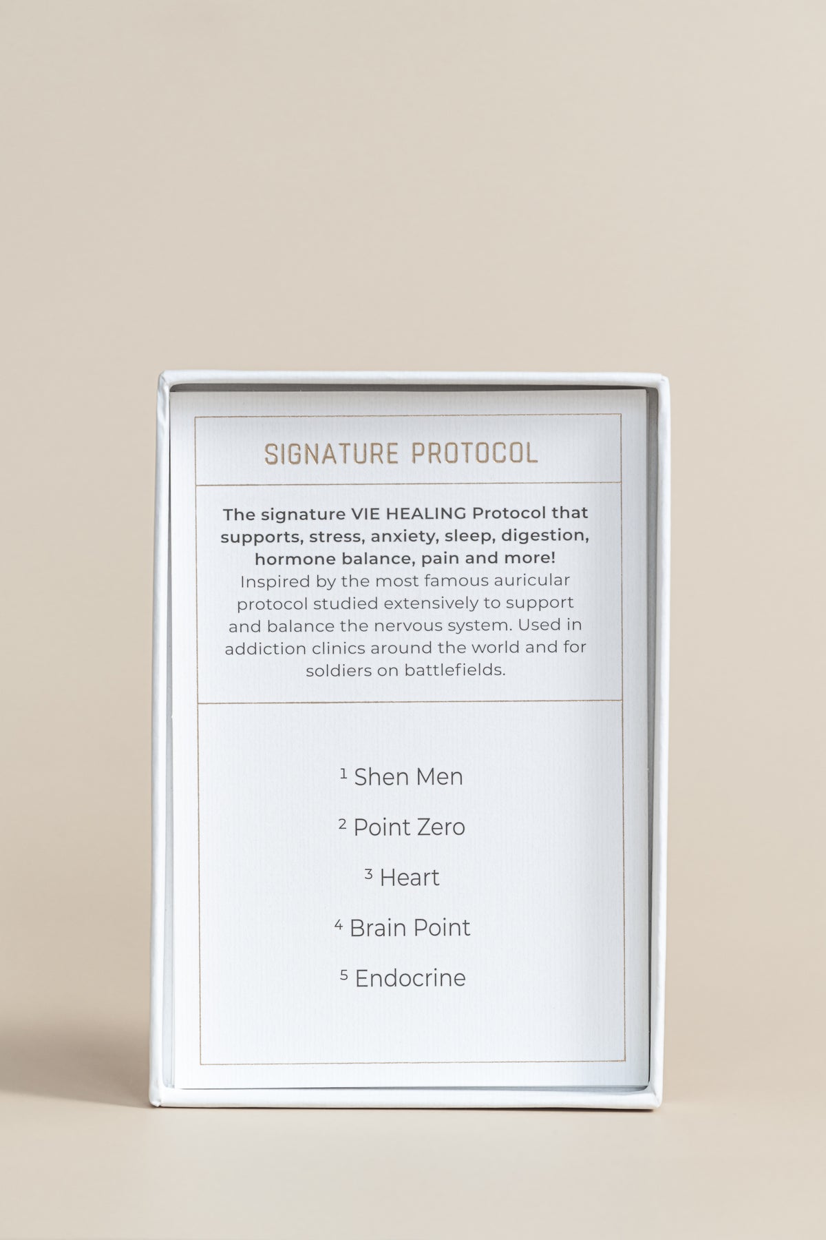 The Foundations Kit supports blood flow and brain chemistry, producing a relaxing effect in the body. Included instructions and ear point charts allow for the application of ear seeds to specific pressure points on the ear, which sends signals to the reflex centers of the brain to reduce stress and anxiety, regulate digestion and hormones, support sleep, and subdue pain.